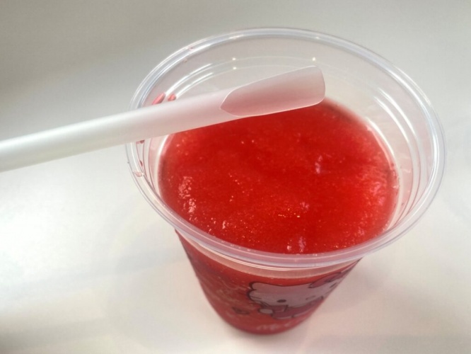 まずは『ハローキティのジューシーいちごスムージー』から。見た目は、驚くほど真っ赤!