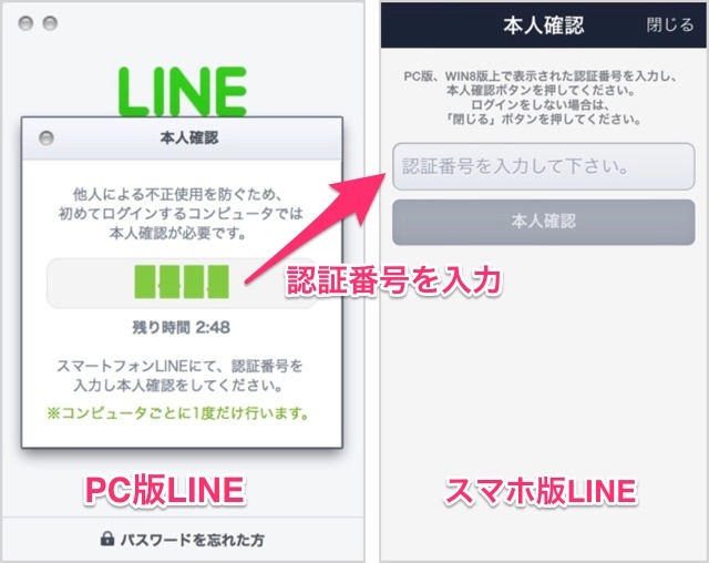 PC版LINEに4桁の認証番号が表示されます。スマホ版LINEを起動すると、認証番号を入力する画面が表示されるので、認証番号を入力してください。これで、PC版とスマホ版の利用者が同じことが確かめられます。
