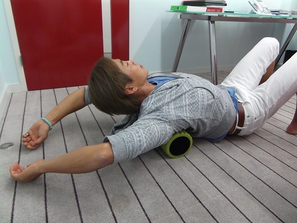 ストレッチ用の太いポールがありますが、それと同じようなものであれば何でもOK! たとえば、配管のようなものがあれば、その上にタオルを巻いて使うとか、大きめのクッションなどを丸めて棒状にし、崩れないようにヒモで固定するとか。要は、身体を乗せてグリグリゆるめることができて、痛くなければ何でもいいんです!