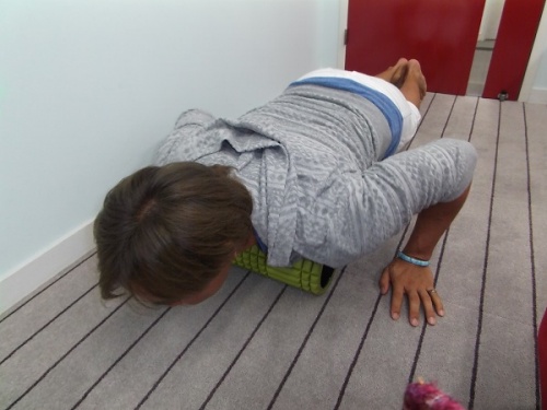 棒が用意できたら、あとは、その上に身体を乗せて、棒の上を転がるようにグリグリするだけ。自分の体重が負荷になるので、強く力を入れたり、ウェイトを用意する必要もありません!
