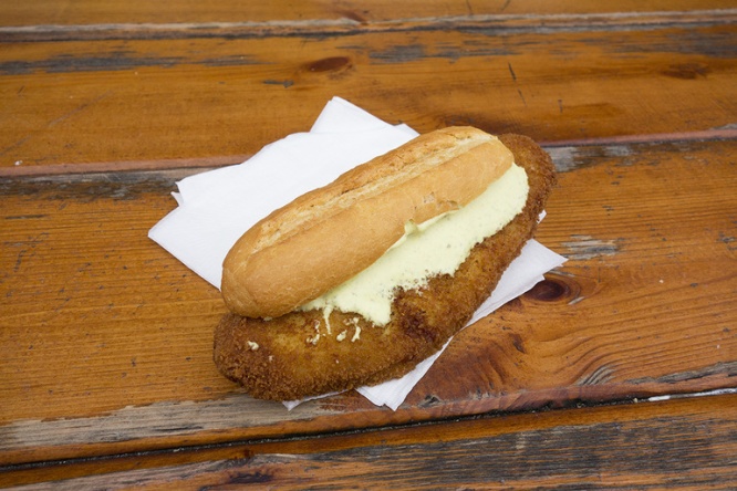 カリッと揚がった、熱々のタラのフライが、パンに挟まって出てきました。