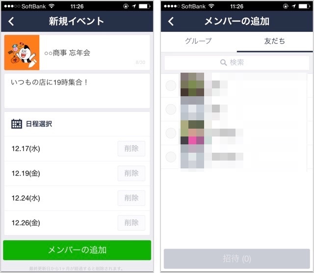イベントを作り終わったら、参加を募るメンバーを追加します。メンバーは友だちとグループから指定可能。すでに仲間内でグループを作っているなら、グループでまとめて指定するのが楽ですね。