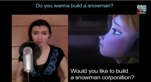 そしてこちらが劇中歌『ドゥ・ユー・ウォント・トゥ・ビルド・ア・スノーマン(雪だるまつくろう)』を数か国語通した後の英語版です。最後のほうで突然サスペンス・ホラー調になり、締めにビジネス調となる部分に注目です。