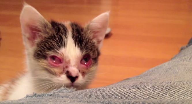 結膜炎で両眼がつぶれてしまっている子猫を拾い、一カ月間保護した様子が記録された動画が「感動的!」と話題になっています。