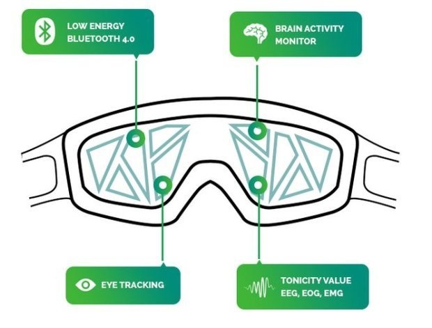 Neuro:onは脳波のほかに筋張力と眼球運動を測定し、集めたデータは専用のスマホアプリに送信されます。