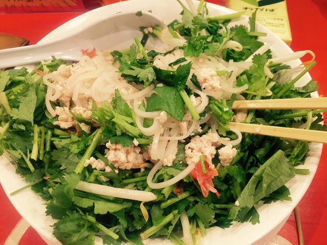 なお、ラーメンと言っても「タイ屋台999」のタイラーメンはビーフン麺。幅広太麺のビーフン麺が、甘く・辛く・酸っぱいというタイ料理ならではのあっさりスープで提供されます。本来のトッピングは挽き肉に海老、もやし…………ああっ! もうパクチーだらけで判別できないよ!(笑)