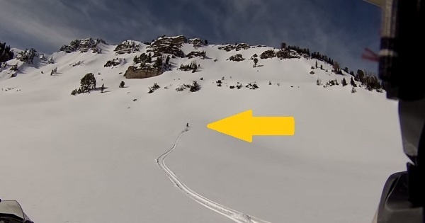 黄色い矢印の先にある黒い点に見えるのが、スノーモービルを操る男性です。
