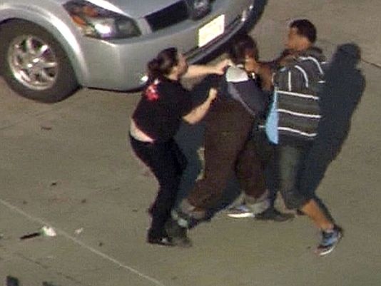 そして次の瞬間、完全にブチギレたジェシカさんは勢いよくミニバンから飛び出し、追突してきた車に向かって駆け出した。車中から強引に引きずり出したドライバーに向かって、「ここは校区なのよ!あんた、何考えてんのよ!」と怒鳴りつけるジェシカさんとボーイフレンド。あまりの剣幕にカージャック犯も抵抗できず、そのまま地面に組み伏せられてしまった。
