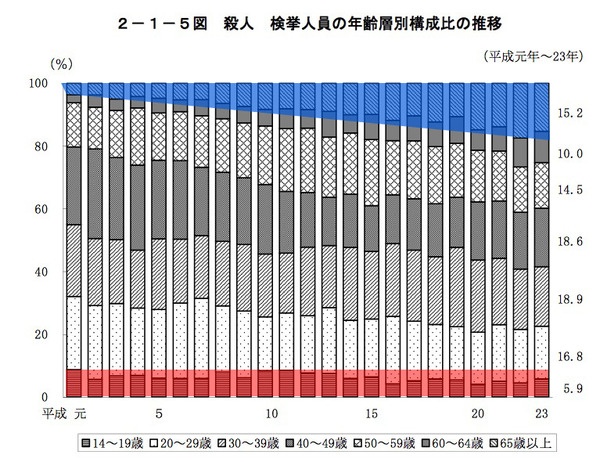 ー年齢別の「殺 人検挙人員の年齢層別構成比の推移」