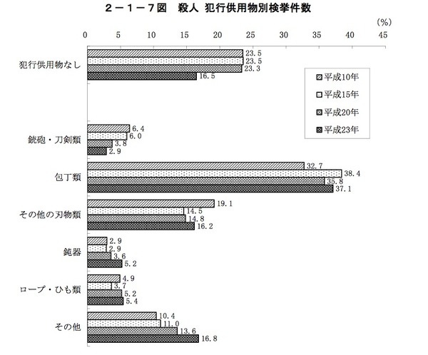 若者による残忍な事件が増えているのであれば凶器がより残忍となってきている可能性は高いのですが、表を確認するとそこまで大きな変化はありません。