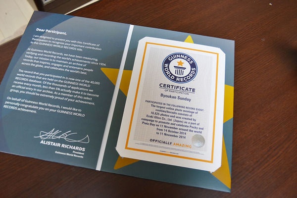 今 回、受賞に至った経緯としては昨年行なわれた「WORLD CHALLENGE11.11」において10月14日~11月11日に集まった「ポッキーフォト」で「クッキー/ビスケットの写真で作ったオンラインフォ トモンタージュ」部門でギネスに申請、世界記録達成と相成った。秒刊サンデーもオリジナルのポッキー写真を投稿して参加し、オフィシャル参加の認定証を頂けることに。