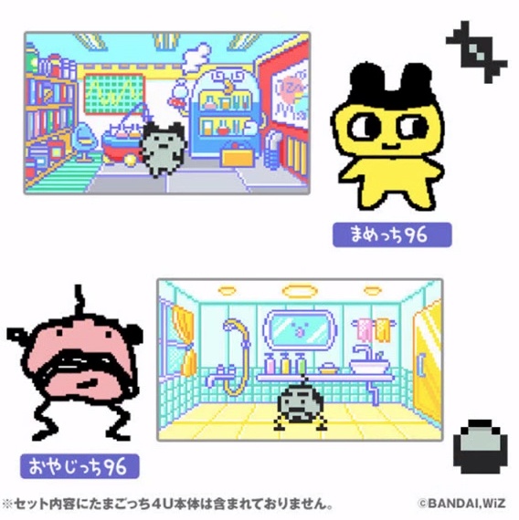 付属のカードで、「初代たまごっちのドット絵キャラクター」がダウンロードできます。今回ゲーム内で限定データがダウンロードできるのは、「まめっち96 ver.」と「おやじっち96 ver.」。