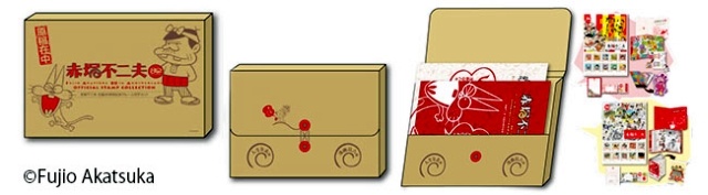 この切手セットは、赤塚不二夫の生誕80周年を記念したもので、人気キャラクターが大集合した「漫画双六編」と赤塚不二夫の生涯を網羅した「人生年表編」の2種類あり、2点セットを購入すると、特典として「オリジナルデザイン画」と「特製ホルダーケース」がつく、というもの。ファン必見の内容です。