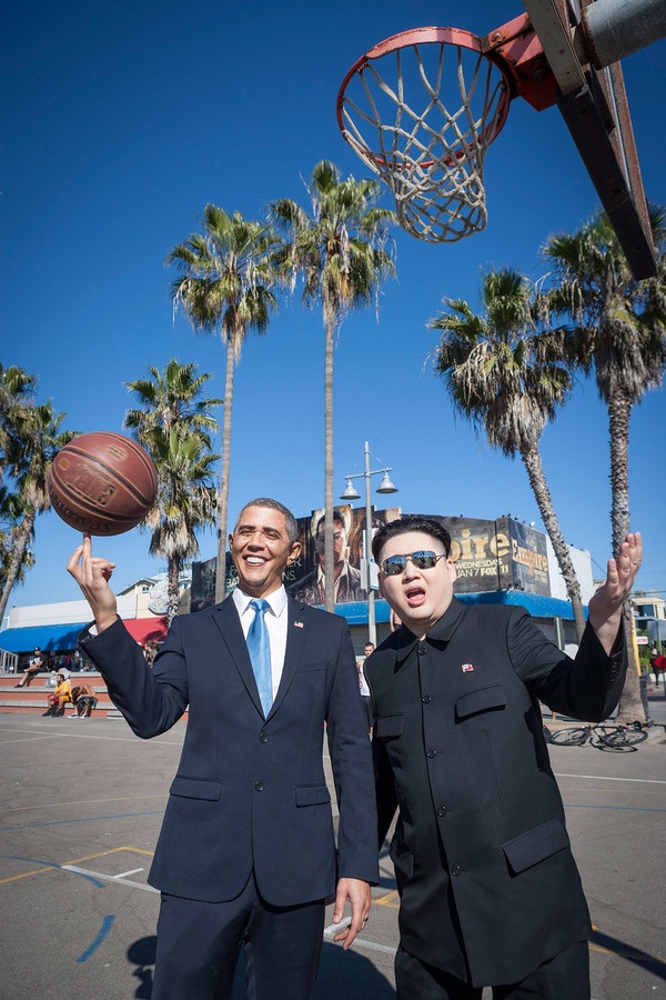 さて、トップの写真のほかのものをご覧いただくと、見れば見るほどオバマと金正恩が若干「おや?」と言わざるを得ない情況となっている。場所はロサンゼルスで彼らは仲良く歩いたり散髪を楽しんでいる。そもそもお二人がその様に仲良くしている情況などありえるだろうか。そう、実は彼ら本物そっくりのそっくりさんなのである。