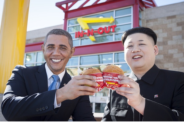 アメリカの大統領「バラクオバマ」と北朝鮮の指導者「金正恩」が、仲良くロスでハンバーガーを食べるシーンが捉えられた。ちょっと待ってください、アメリカは北朝鮮に政治的な制裁を行っており、北朝鮮もアメリカを敵視している。従って彼らは敵同士、しかし実は彼らはプライベートでは仲良しというとんでもない裏事情がある可能性も早速他のショットをご覧ください。
