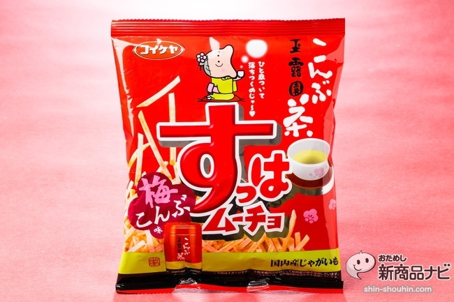 梅、梅、梅! 今年のコイケヤは見渡す限り、梅まつり! 現在好評発売中である『スティックすっぱムーチョ 梅こんぶ味』は、すっぱムーチョシリーズと「玉露園のこんぶ茶」のコラボレーション商品。梅が咲き誇るこの季節、日本茶を片手にじっくり味わってみたい。