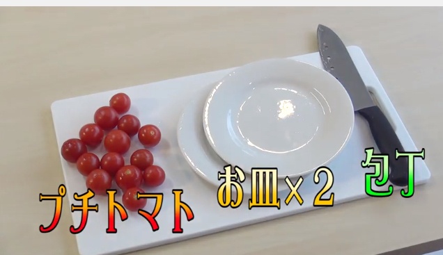用意するものは、プチトマト、お皿×2、包丁。
