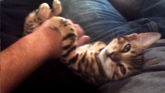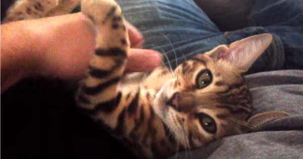 4ヶ月のベンガル猫の子猫モリーは飼い主さんのいうことがわかるみたいです。 子猫と和やかに会話を楽しむ男性をご覧ください。