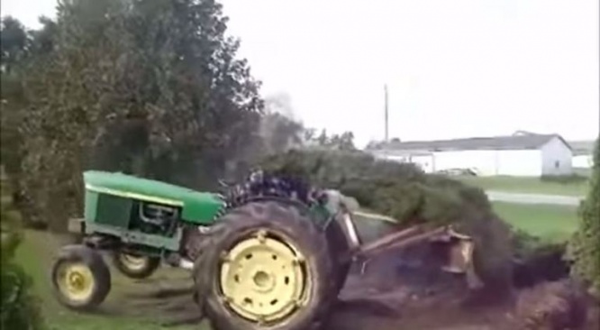 トラクターで木を引き抜こうとする男性と、引き抜かれまいと抵抗する木の戦いが面白すぎます。