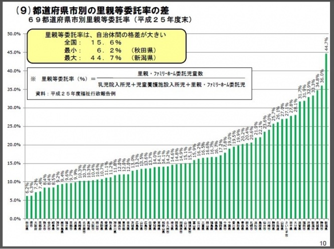 上記の表は、69都道府県市別に里親等委託率をグラフ化したものです。最も里親制度を利用して子どもを育てているのは新潟県の里親等委託児童率で44.7%でした。