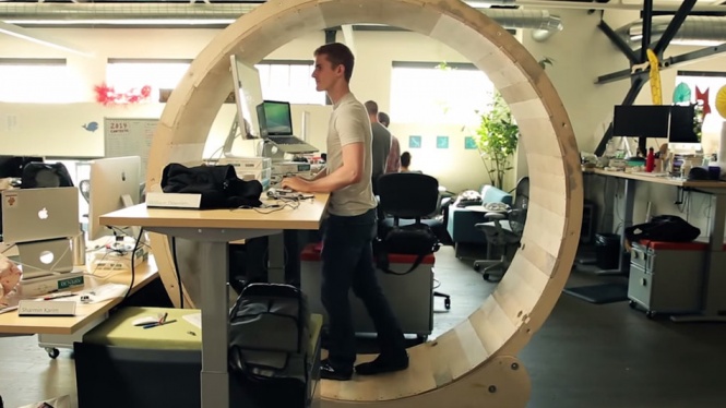 なんと、デスクにワッカがついて、歩きながら仕事ができるのです! 誰もが見たことのあるハムスターが遊ぶあのホイールサークル。あれをそのまんま人間用のサイズにして、そこにデスクを配置。
