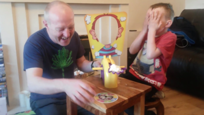 兄弟でパイ投げゲームを紹介してくれてます。ハラハラドキドキ。