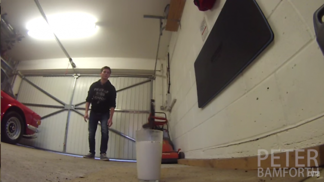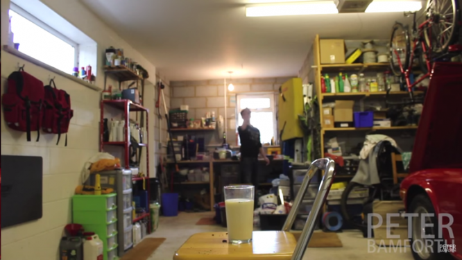 いろんなところから牛乳を入れたグラスをめがけて、ピーターさんがオレオを放り投げます
