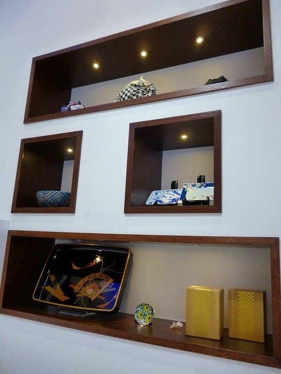 日本の百貨店では、缶に入って売られた商品しか見ませんが、ドバイのヨックモックは、空間を上手に使って、商品の高級感を演出しています。棚の中には皿や茶わん、漆の盆、かごなど、日本の芸術品の域といえる伝統的な“器”が飾られています。