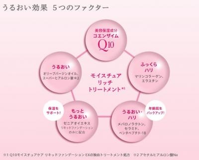 「Q10モイスチュアケア リキッドファンデーションEX」は肌を保湿するだけでなく、ファンデーション本来の「カバー機能」も申し分なし。独自のメークアップテクノロジーを搭載することで、年々増えてくる小じわやたるみを全面的にカムフラージュ。さらに、「リフトアップフィルム・スーパーEX」「たるみ補整3Dパール」を配合しているので、メイクをすることで若々しい印象の顔立ちに見せてくれます。