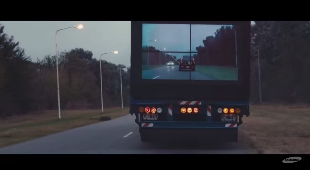 高速道路に限らず、ドライブ中に前の車が大型トラックだと正直威圧感を感じますよね。 追い越そうにも、トラックの前がどうなっているのかわからず対向車線に出てから危ないことに気づいて、出戻ったり…。 そこでSAMSUNGが画期的なトラックを開発しました!