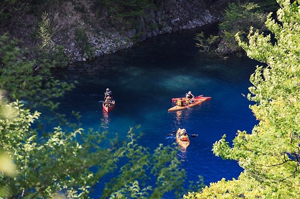 奥四万湖でカヌーを楽しむ人たち(四万温泉協会提供)