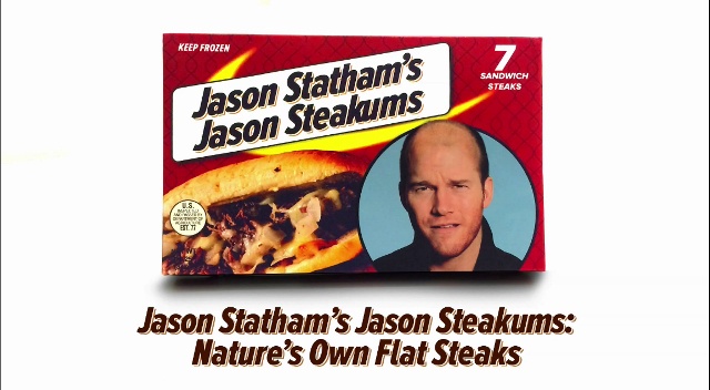 アメリカで販売されている冷凍の薄切りステーキ『Steak-umm』をパロった『Jason Statham's Jason Steakums』を宣伝し、食べ方を教えてくれるステイサム。