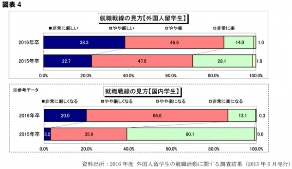 就職戦線をどのように見ているかを尋ねたところ、「非常に厳しい」と感じている学生は、2015年卒者では22.7%だったのが、2016年卒者では38.3%と大きく跳ね上がりました。この傾向は国内学生も同様で、採用スケジュールの変更で就職活動全般が不透明であること、短期決戦となることなど、不安が先行していることが数字に表れていると言えます。