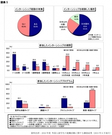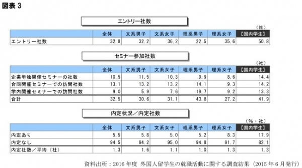 今回調査を実施した2015年5月時点でのエントリー社数は外国人留学生全体で32.8社と、ほぼ同時期の日本人学生の50.8社に比べて3割以上少ない社数でした。しかし、セミナーに参加した社数は全体では32.5社で、国内学生の41.9社と比較して差は縮まっています。5月時点で内定を得ているのは全体で5.5%でした。国内学生と比べて就職活動の進捗が遅れている様子が表れています。