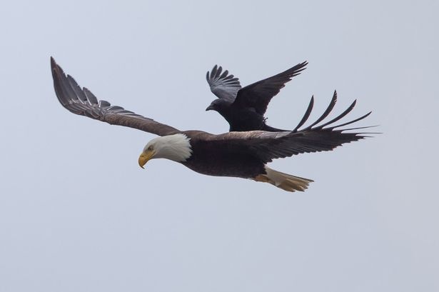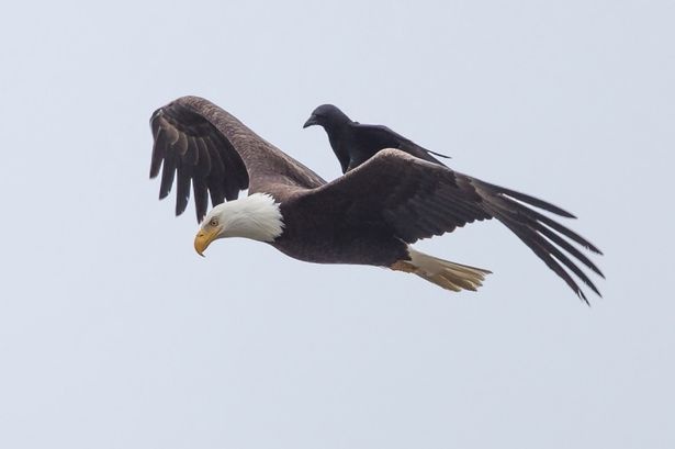 毎日従わせているわけではないようで、獲物を探して飛行中の白頭鷲の背中に、カラスが着陸した瞬間がとらえられたという。