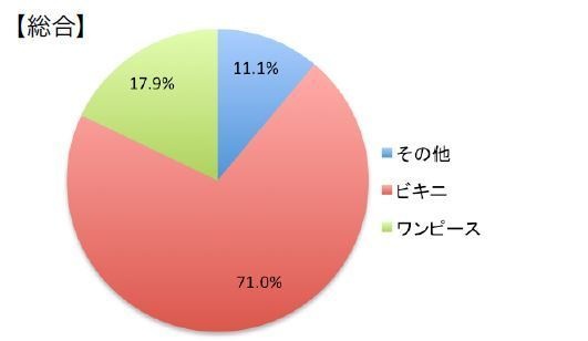 持っている水着の種類については、全体で「ビキニ」が71.0%と圧倒的に多く、ワンピースは17.9%。年代別では、20代前半のビキニ率が一番多く(82.4%)、次いで、20代後半が76.9%となった。一方、10代はワンピース率が他の年代と比較すると高く、26%を占める結果となった。