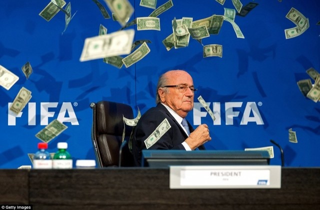 汚職疑惑のブラッター会長、会見中にニセ札を浴びる!