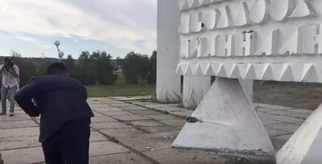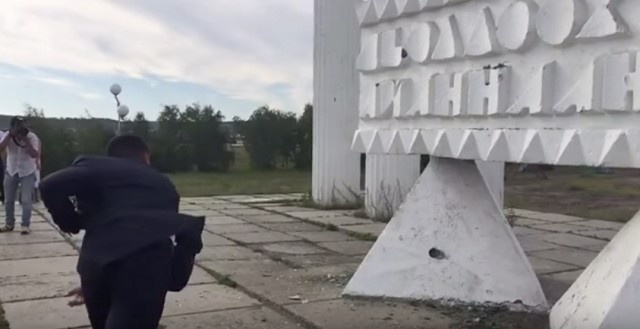 何の目的かはよくわからないが、シャンパンボトルを投げつけて割ろうとする男性。