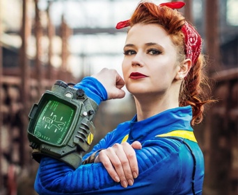 Vault-Tec社の111ジャンプスーツを身にまとった赤毛の美女。左腕には『Fallout』の世界を生き延びるのになくてはならないPip-Boyを装着しており、力強いポーズがキマっています。これは1940年代、第2次世界大戦時に描かれたロージー・ザ・リベッターという女性溶接工のイラストを、『Fallout』テイストにマッシュ・アップしたコスプレ。Nukaコーラのボトルにも注目です。 披露しているのは、チェコ共和国にお住まいのBaty Alqu...
