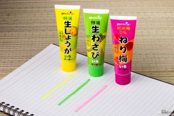 チューブわさびにソックリ な『わさびいろマーカー』、”しょうがいろ””ねり梅いろ”とともに蛍光ペンとして楽しく使える!