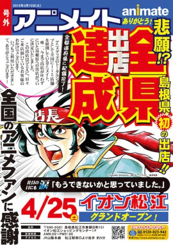 アニメイトがついに47都道府県を制覇! 島根県に新店舗オープン 2015.03.10 13:05 KAI-YOU.net タグ: 全国制覇 アニメ専門店 アニメイト イオン松江 島根県 アジア アニメイトがついに47都道府県を制覇! 島根県に新店舗オープン アニメに関するキャラクターグッズなどを販売するアニメ専門店・アニメイトが、島根県の松江市に新店舗「アニメイト イオン松江」を、4月25日(土)にグランドオープンする。 この出店によりアニメイトは、全国47都道府県に店を構えることとなり、アニメ専門店としては初の全国制覇となる。 俺たち、私たちのアニメイトが全国制覇の快挙! アニメイトは1983年に池袋に1号店をオープンさせて以来、関東、京阪神、仙台、札幌、福... 続きを読む