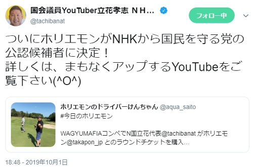 (画像)「NHKから国民を守る党」からホリエモンが出馬か? 党首立花孝志が「候補者に決定」と投稿