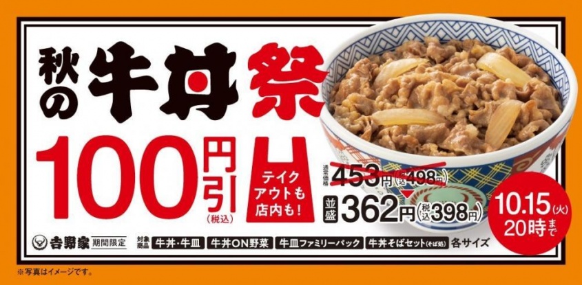 (画像)吉野家「秋の牛丼祭り」開催。7日間限定で牛丼・牛皿を100円引きで食べられるよ~!