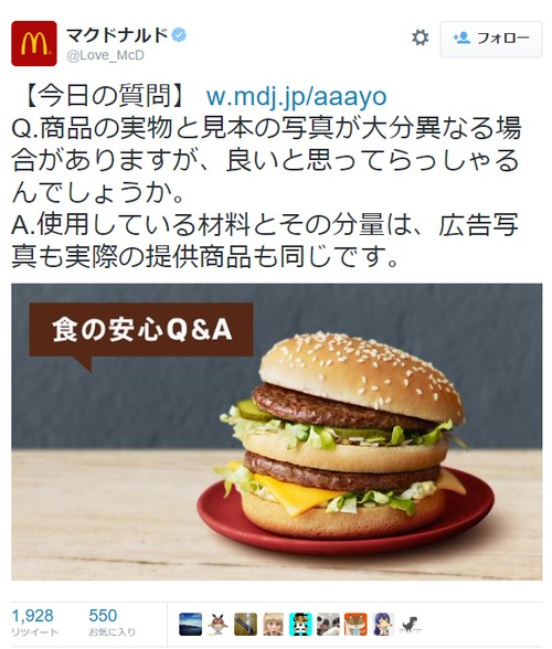 マクドナルドが公式ツイッターで見本と実物が違うことに「材料や分量は同じです」と言及 → 実際はフォトショップ使用